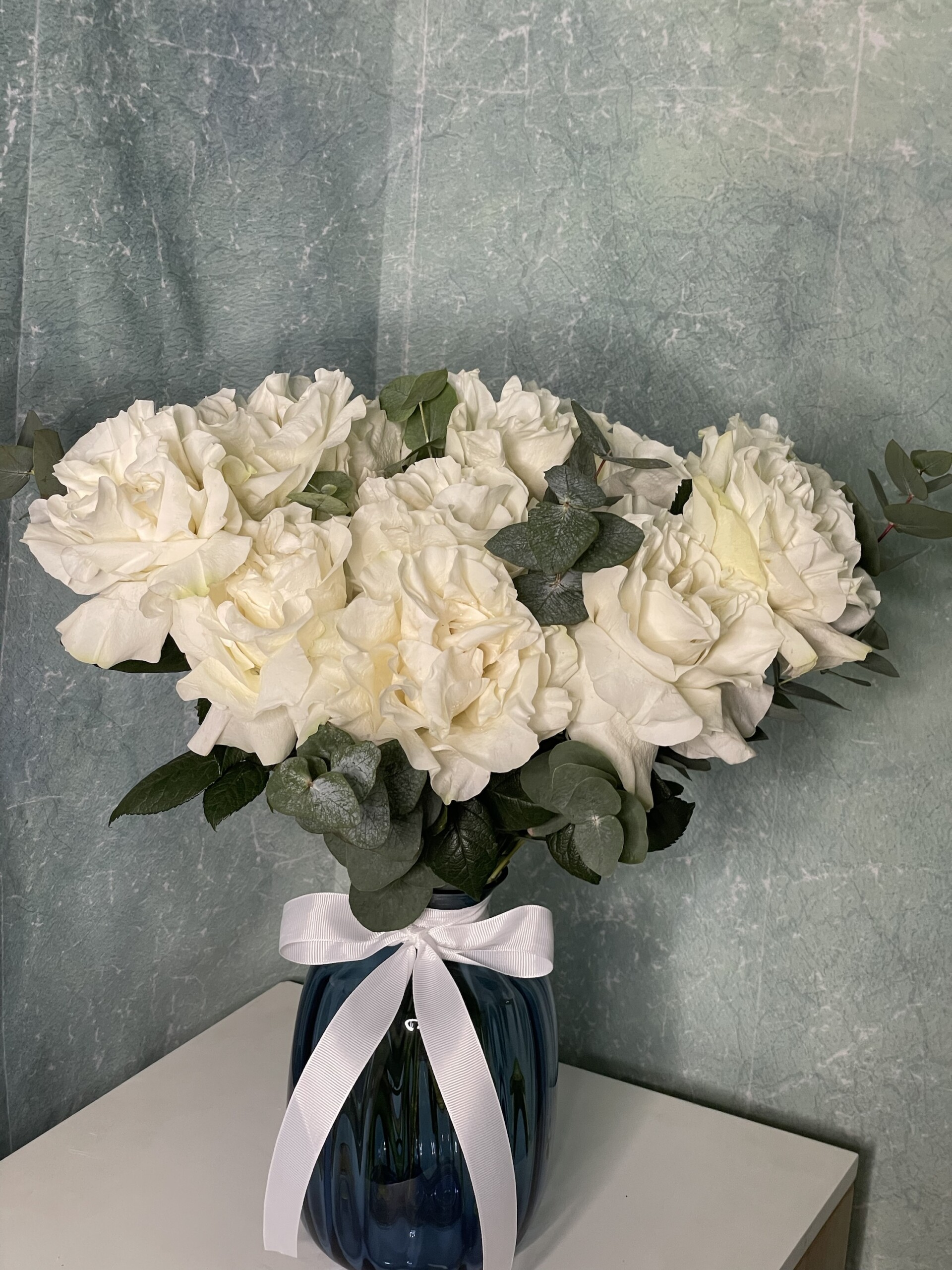 An elegant arrangement of 9 premium reflexed Ecuadorian roses, beautifully displayed in a stylish blue glass vase. Perfect for luxury gifting, home décor, or special occasions.